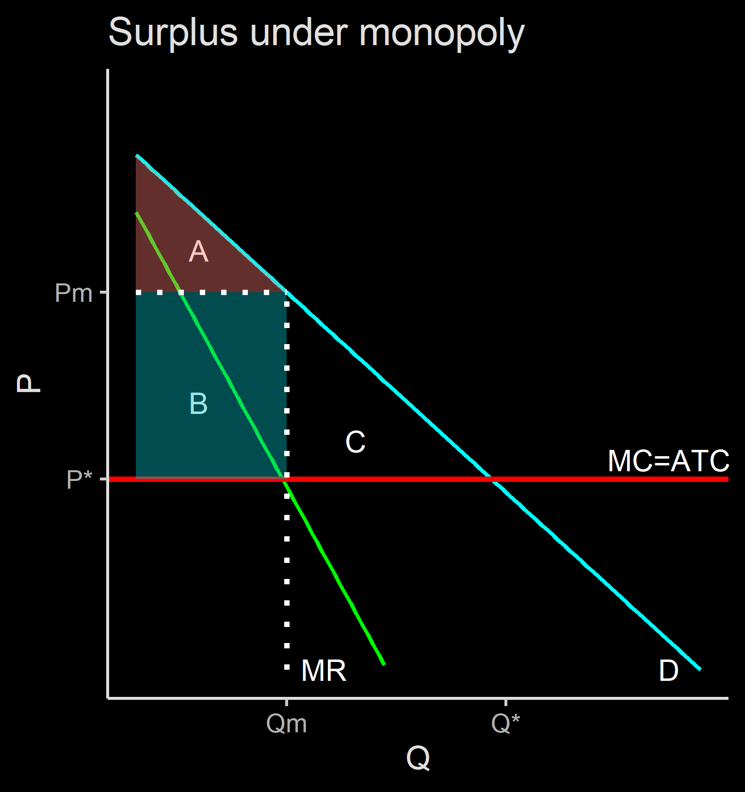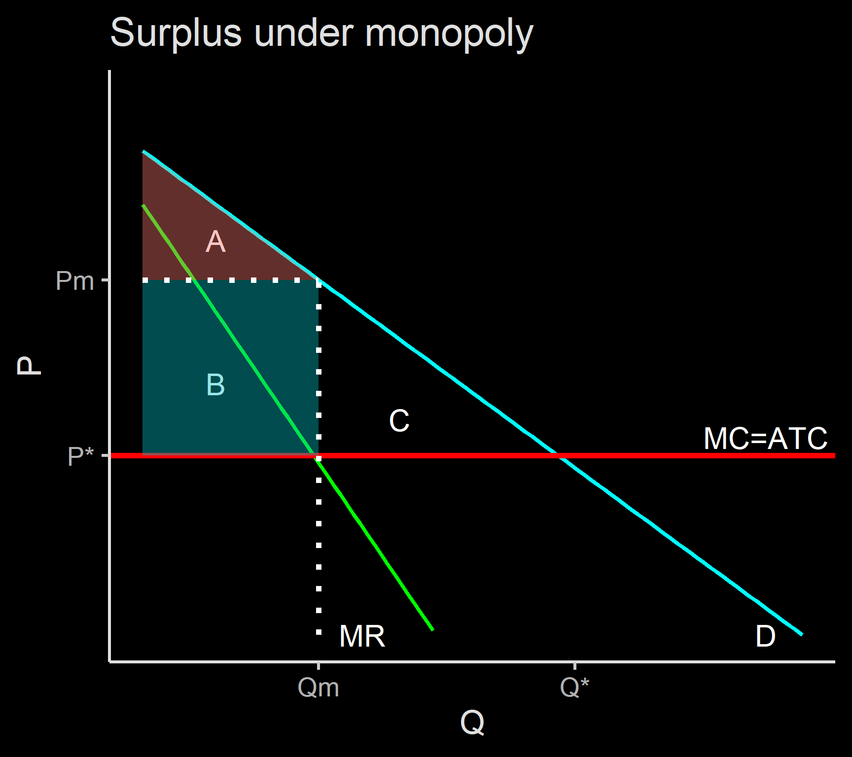 producer. Monopoly increases P and reduces Q, CS=A, PS=B, and DWL=C (loss transferred to no one)
