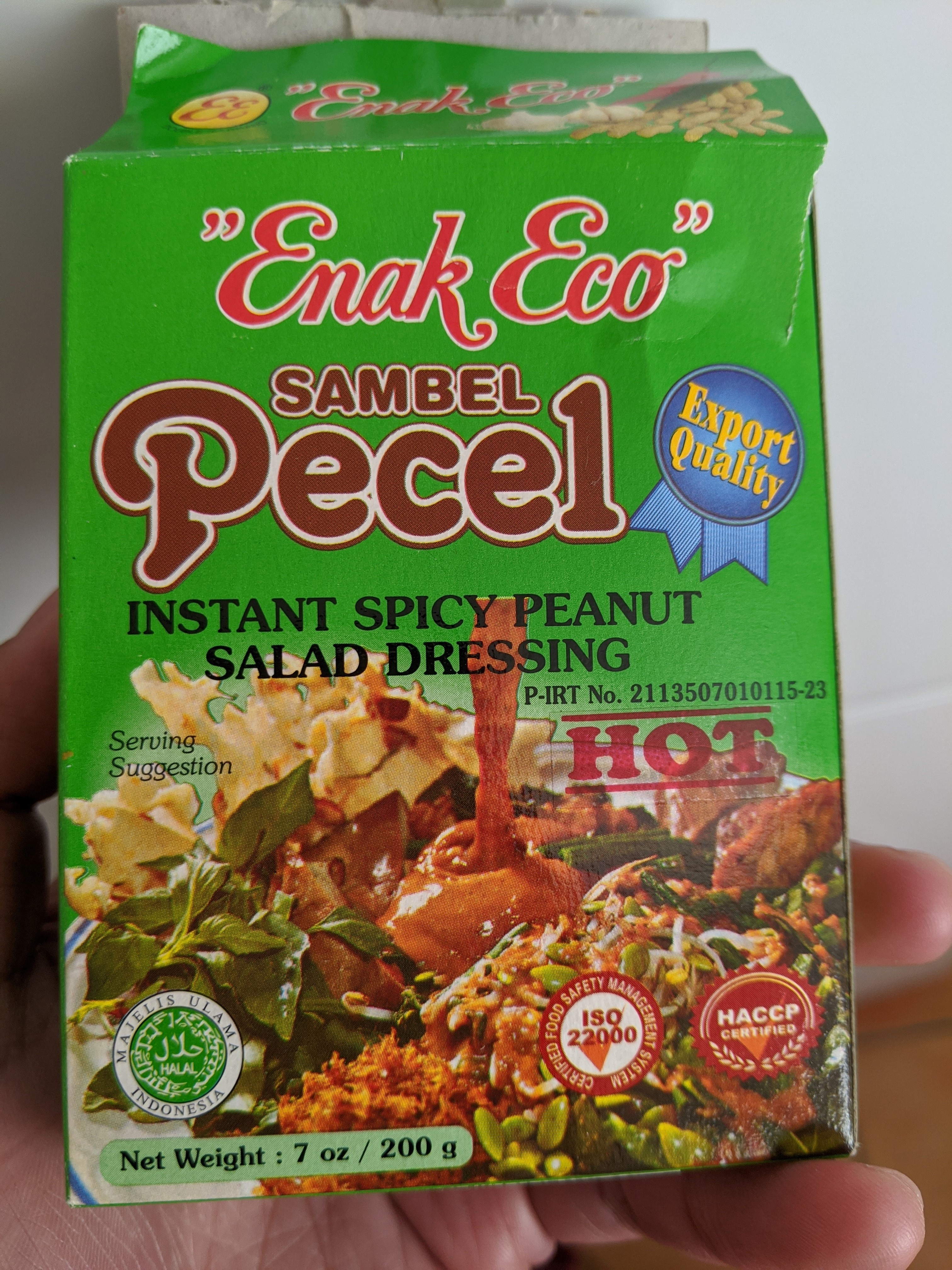 But my wife is far from a chef. What made it delicious was that the peanut sauce was store-bought, not homemade. A few days ago we went to an Asian grocery store and bought this brand of bumbu pecel (peanut sauce mix).