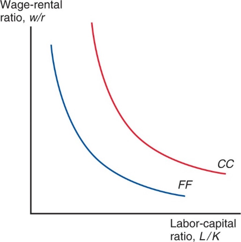 \[ \frac{a_{LC}}{a_{KC}} > \frac{a_{LF}}{a_{KF}} \\ \frac{L_C}{K_C} > \frac{L_F}{K_F} \]