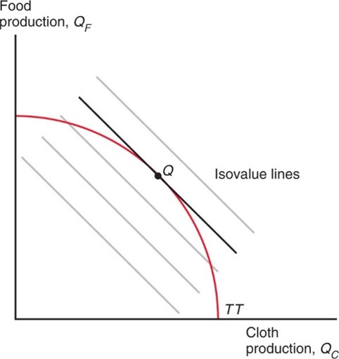 • An economy chose \(Q_C,Q_F\) to maximize \(V=P_CQ_C+P_FQ_F\) given \(\frac{P_C}{P_F}\).