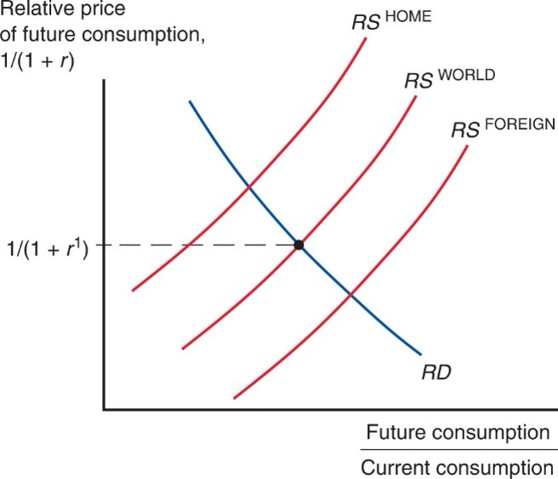 • The real interest rate rises in the country that lends (home) and falls in the country that borrows (foreign) due to intertemporal trade.
