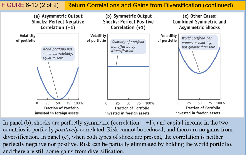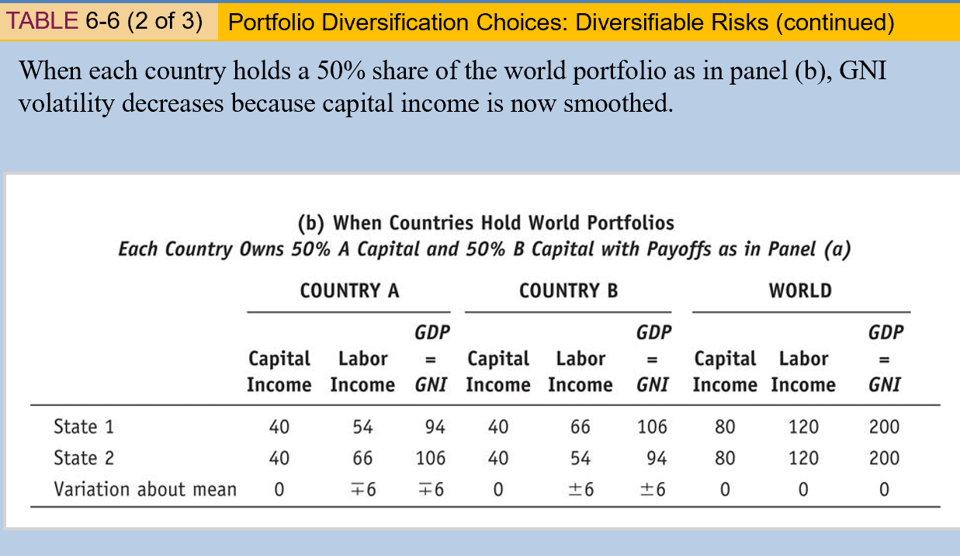 Each country’s payments to capital are volatile. A portfolio of 100% of country A’s capital or 100% of country B’s capital has capital income that varies by plus or minus 4 (between 36 and 44). But a 50–50 mix of the two leaves the investor with a portfolio of minimum, zero volatility (it always pays 40).