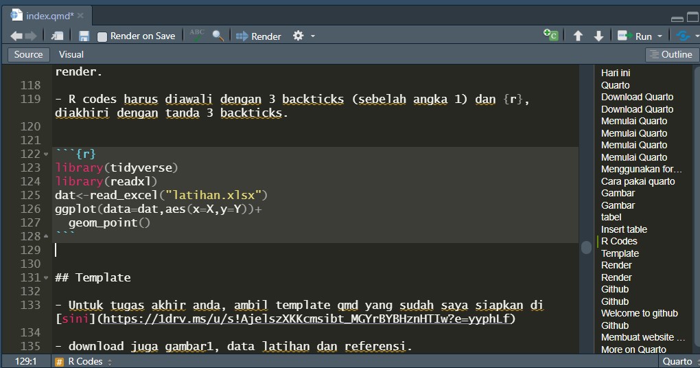 Pelajari baik-baik file qmd-nya, lalu klik panah kecil di sebelah \(\Rightarrow\)Render.