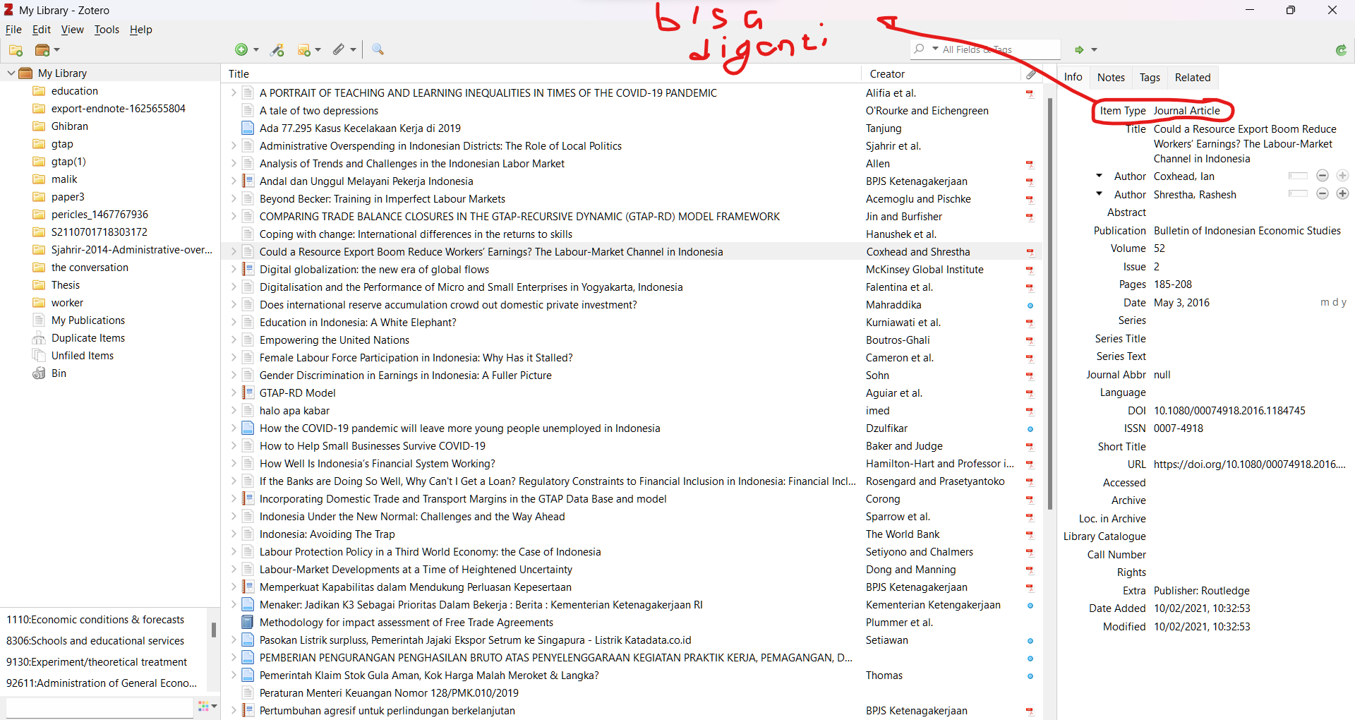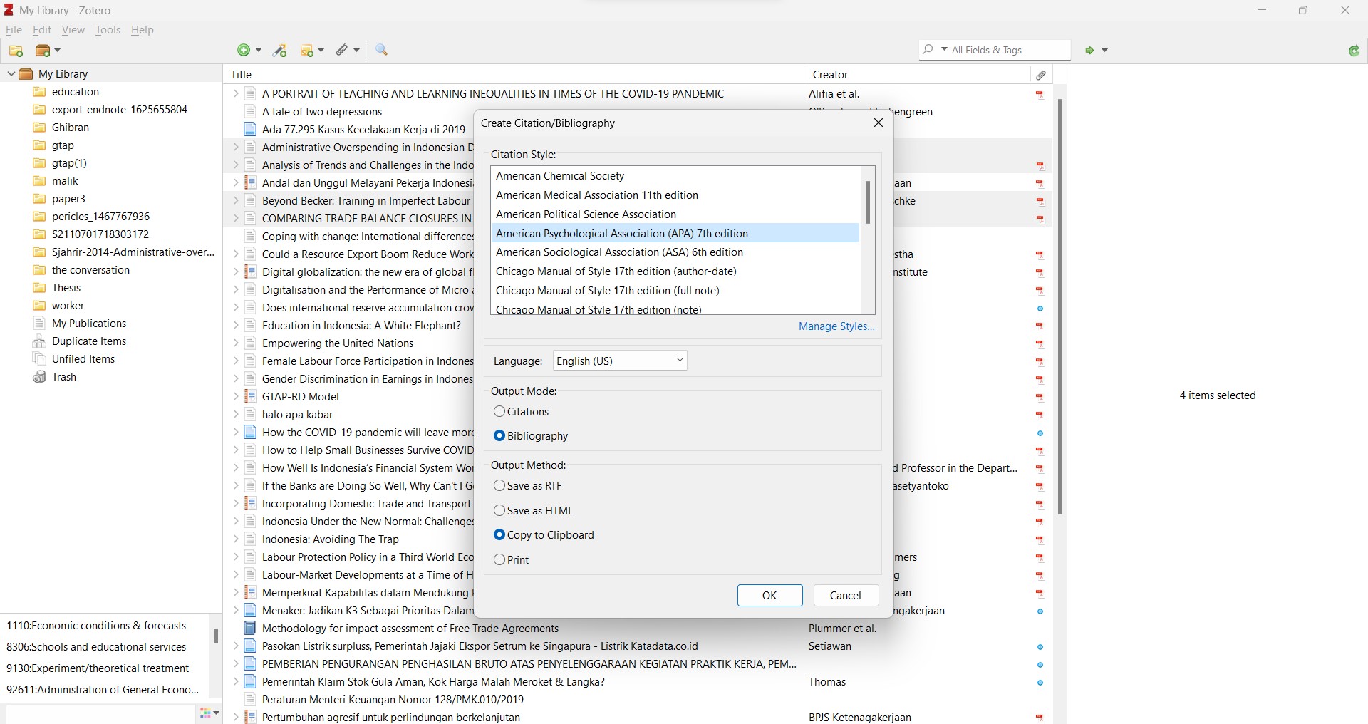 • Output dari Zotero bisa jadi kurang sempurna. Selalu cek hasilnya setelah library dari Zotero di-paste di daftar pustaka anda.