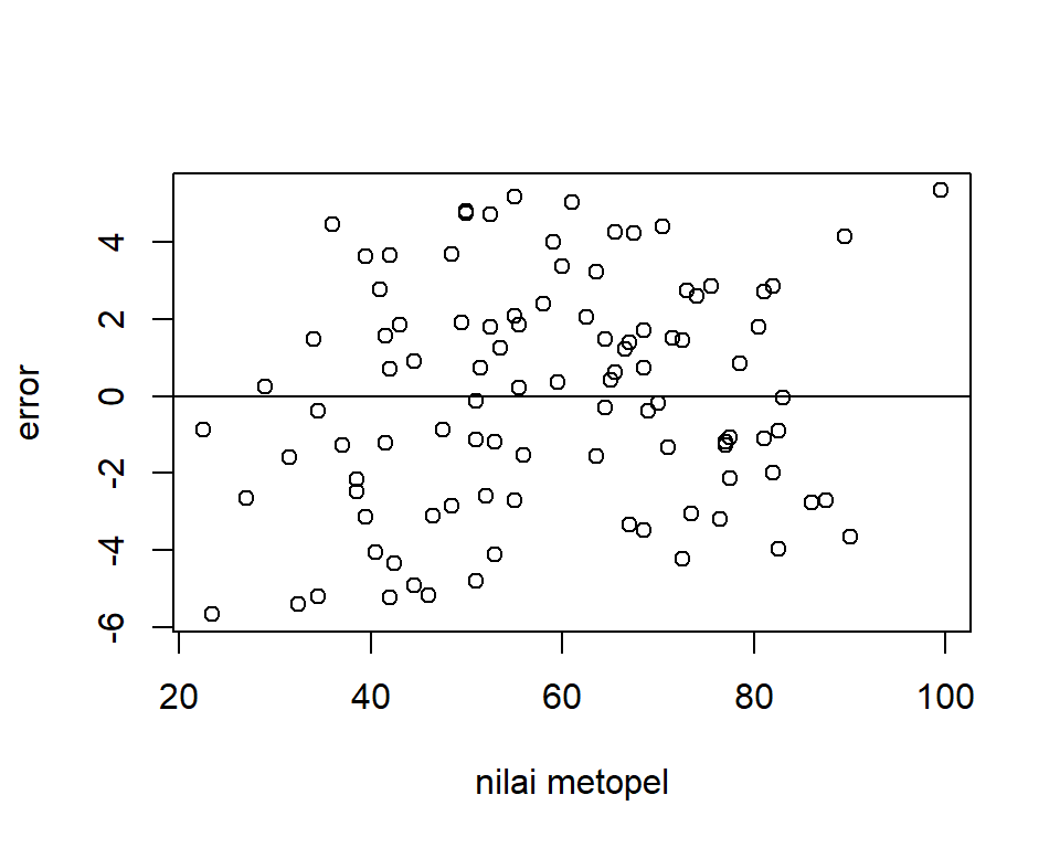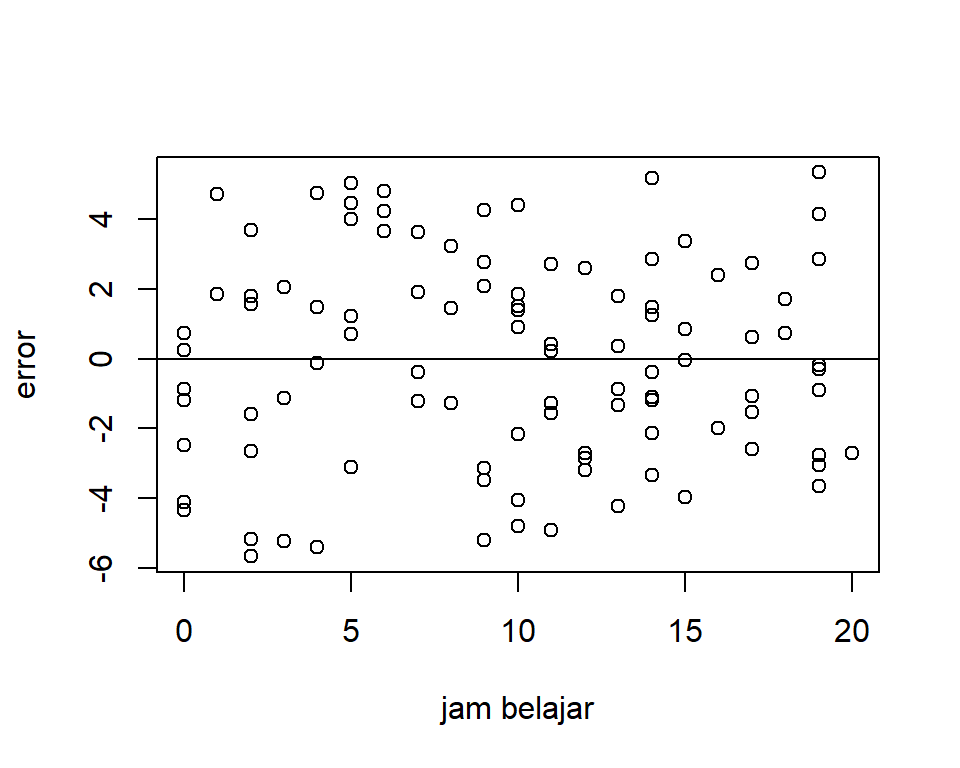 plot(dat2$X,dat2$u,xlab="jam belajar",ylab="error")