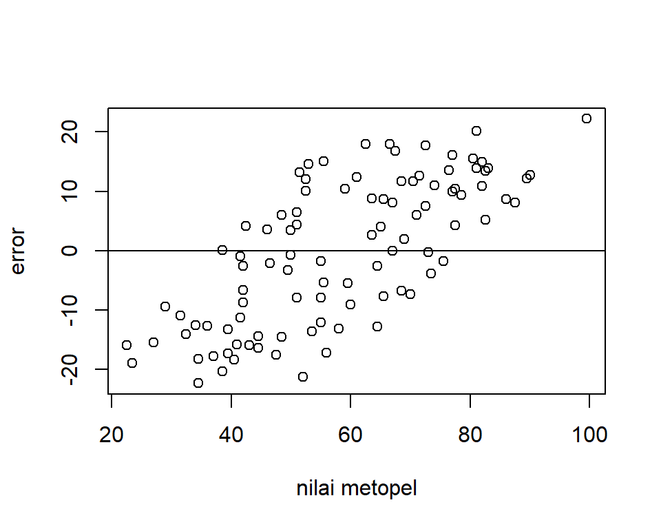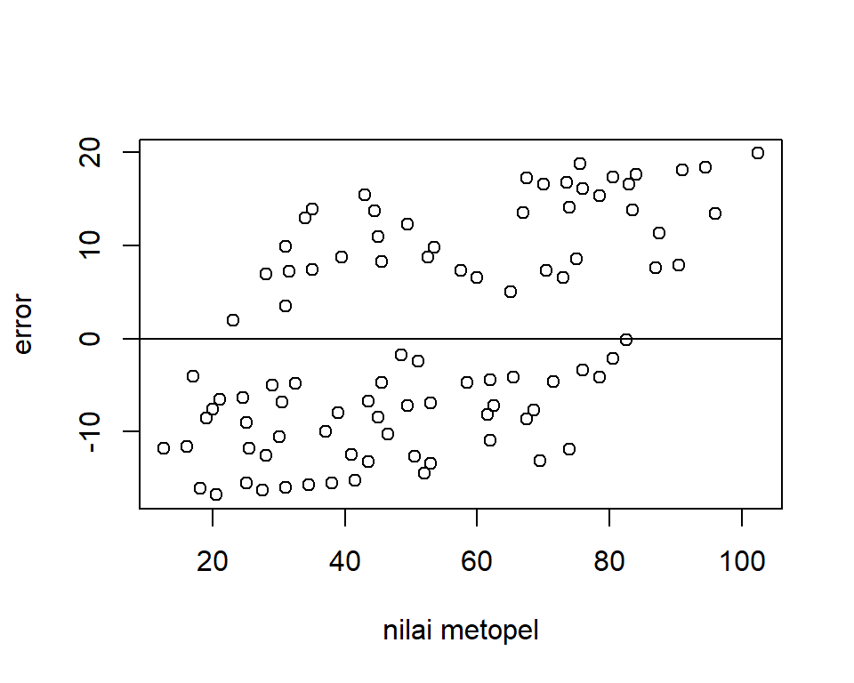 plot(dat2$Y,dat2$u,xlab="nilai metopel",ylab="error")