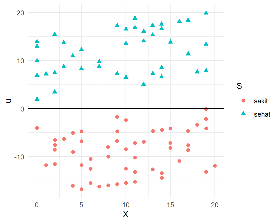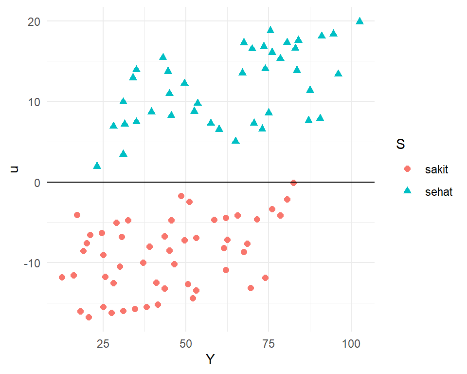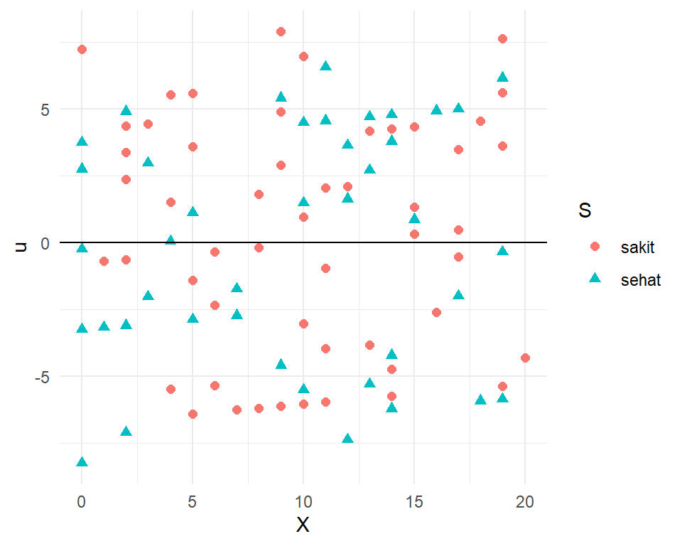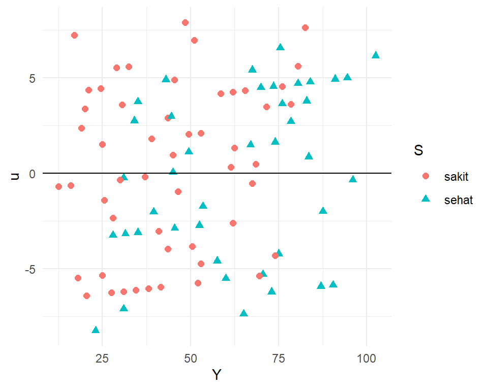 • Untuk observasi sehat: \(Y=\beta_0+\beta_2+\beta_1X+\mu\)