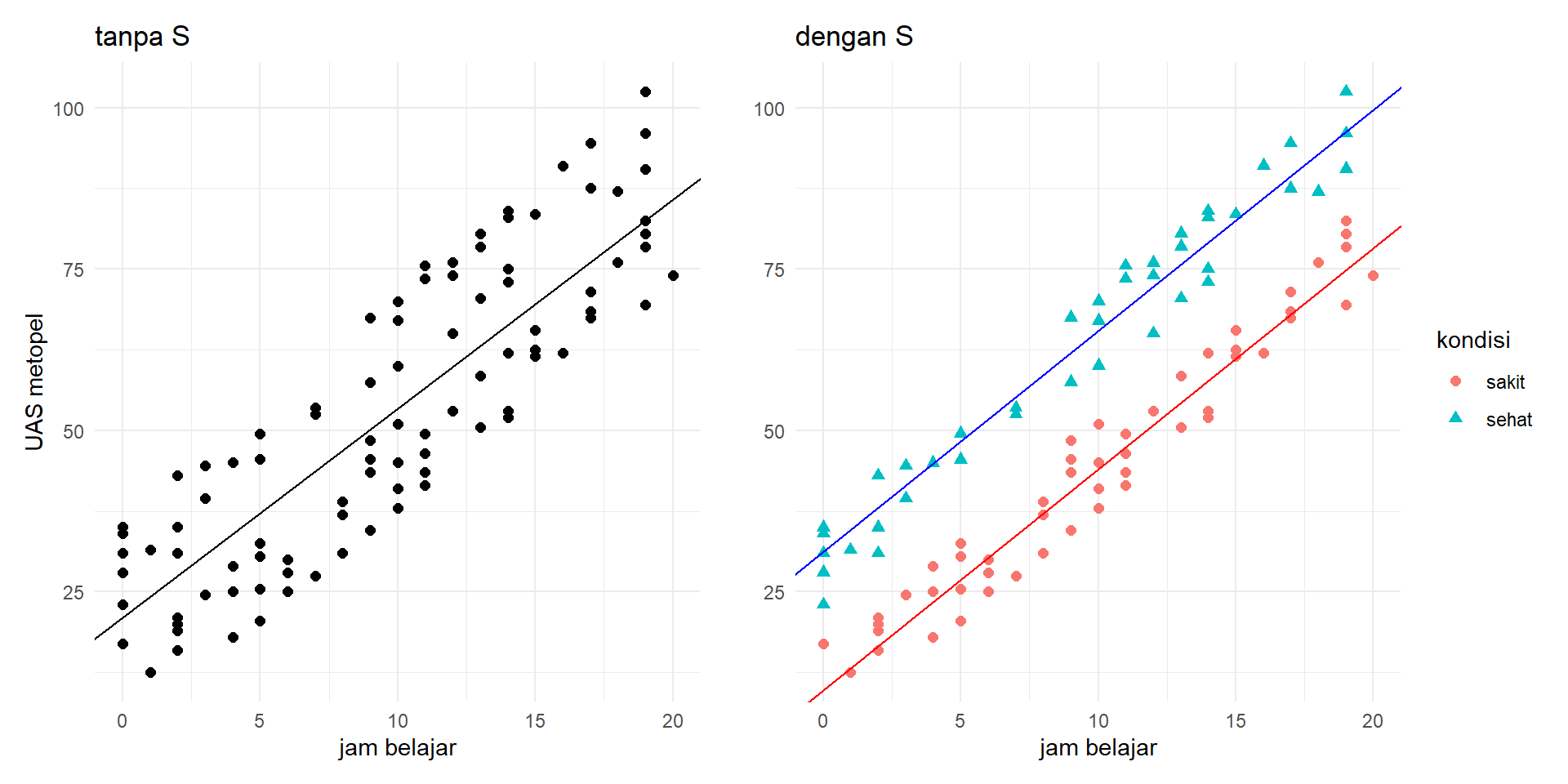 • \(\beta_2\) adalah beda nilai UAS antara yang sehat dan sakit untuk jam belajar yang sama.