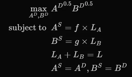 return print(f'Goods market: \n harga A adalah {pa:,.2f} dan harga B adalah {pb:,.2f} \n Jumlah produksi (A,B) adalah {(A,B)} \nLabor market: \n gaji adalah {w:,.2f} \n dari total {L:,.2f} pekerja, sebanyak {LA:,.2f} bekerja di industri A dan {LB:,.2f} di industri B \nmakro: \n PDB nominal adalah {npdb:,.2f} \n PDB riil adalah {pdb:,.2f} \n level harga adalah {p:,.2f} \n welfare di negara ini adalah {U:,.2f}')