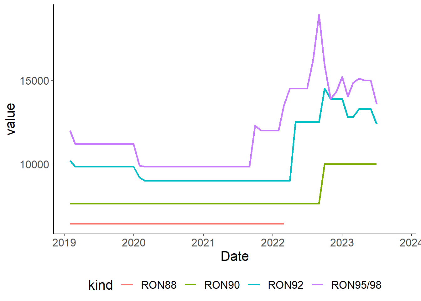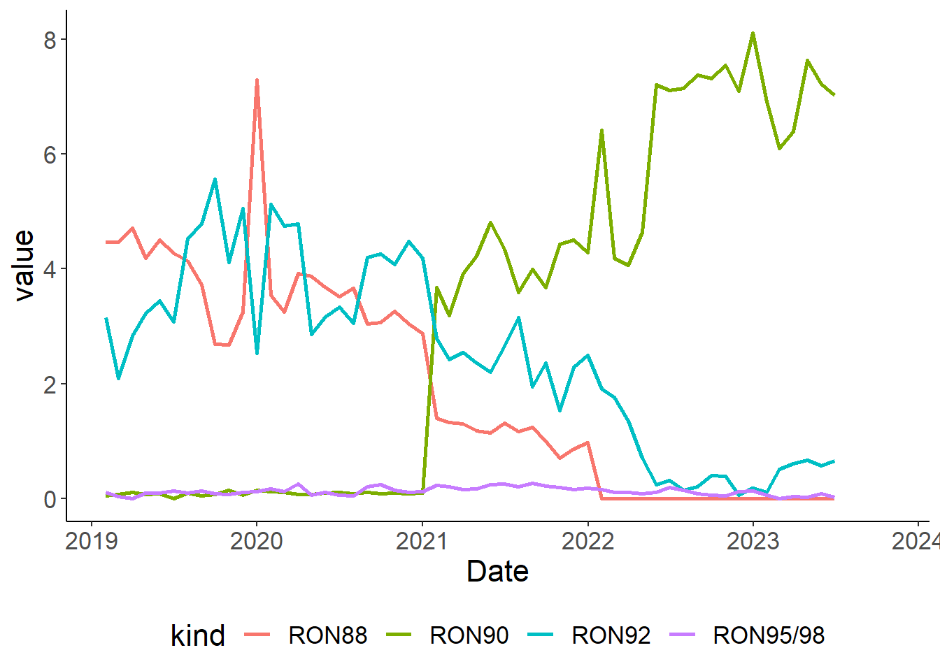 Melihat dampaknya langsung ke BBM mungkin cukup sulit. Hal ini karena pasar BBM di Indonesia dikontrol dengan sangat ketat oleh pemerintah. Dapat dilihat pada Figure 3 (a) bahwa konsumsi RON88 terjun bebas karena produksi BBM jenis RON88 dihentikan. Sebelumnya, diperkenalkan RON90 yang produksinya terus meningkat sampai sekarang. Secara keseluruhan, produksi BBM masih tinggi.