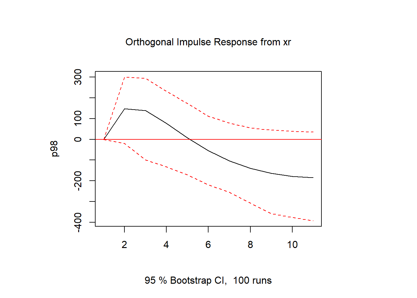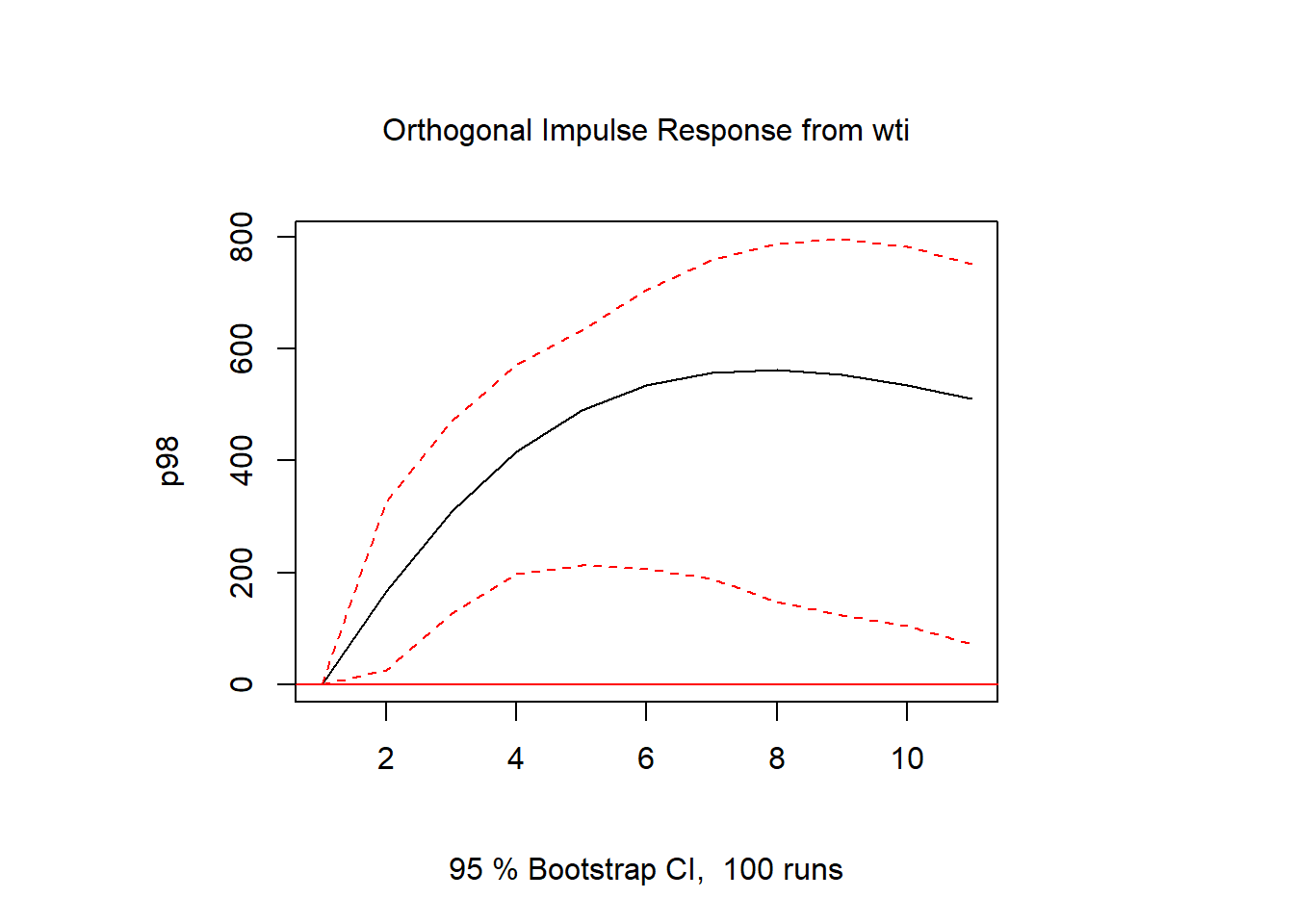 berikutnya dilakukan impulse response function, yaitu apa yang terjadi pada harga RON95/98 di jangka panjang jika ada shock sebesar 1 standar deviasi terhadap harga WTI dan nilai tukar.
