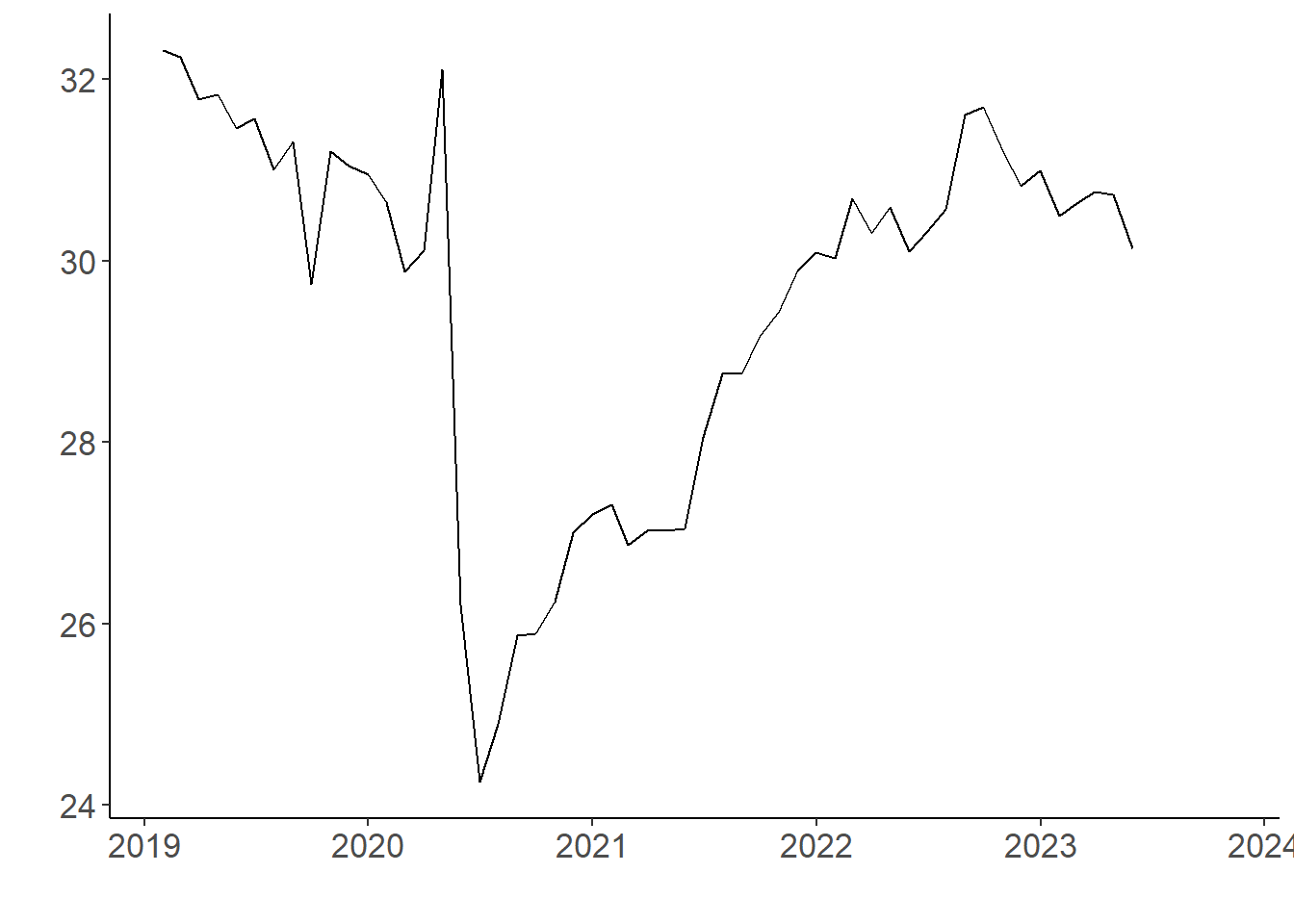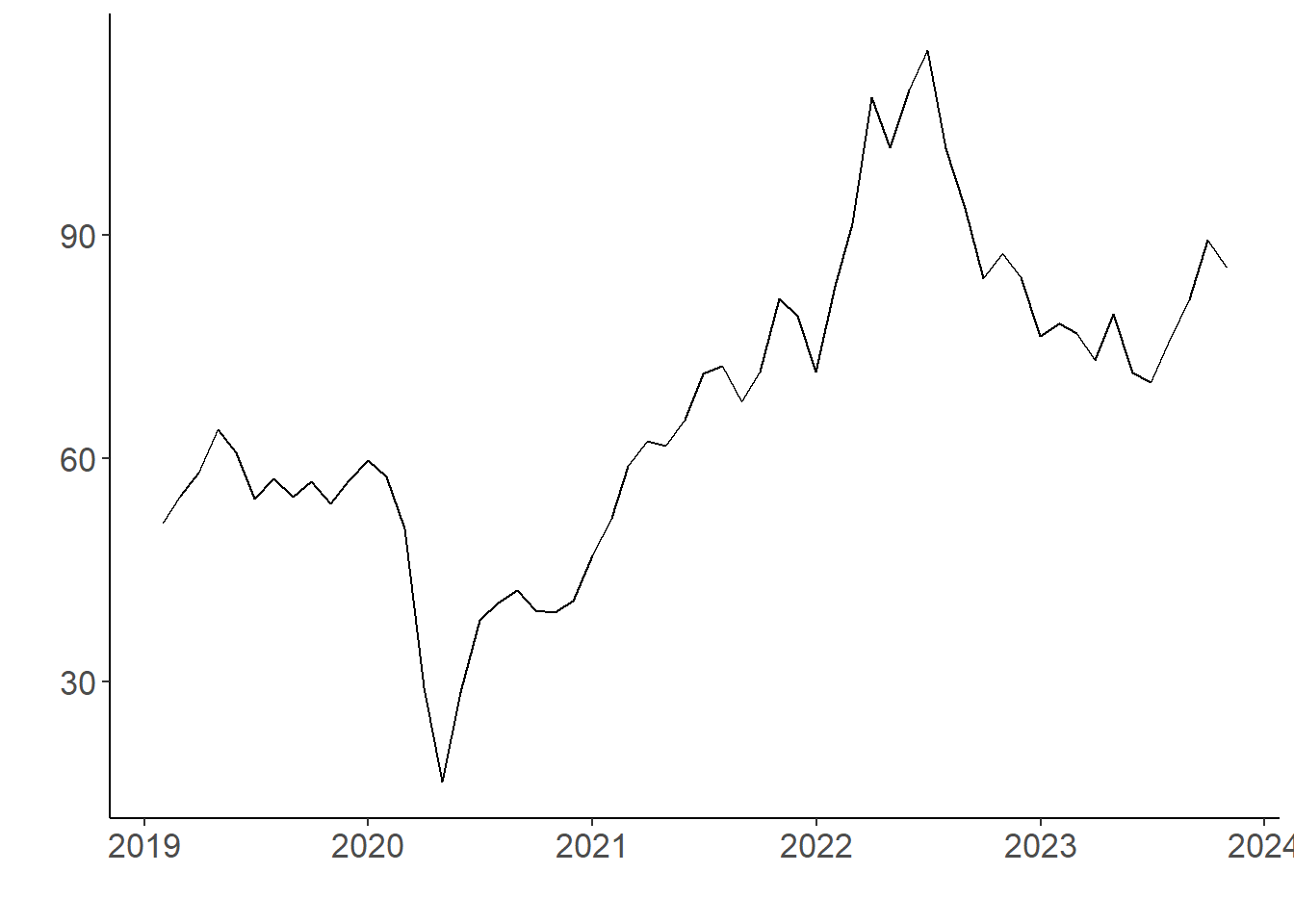 Figure 1 (b) menunjukkan tren harga yang serupa. Akan tetapi, harga minyak WTI terus menanjak dan sudah tembus 110 USD/barrel pada bulan Mei 2022. Namun, tren ini kembali menurun dan stagnan tak lama kemudian. Akhir-akhir ini, harga minyak kembali naik ke level yang sesuai dengan asumsi APBN. Meski demikian, OPEC masih berenacan untuk menahan produksi untuk mengerek naik harga minyak (Seba 2023). Karena itu pemerintah harus waspada.