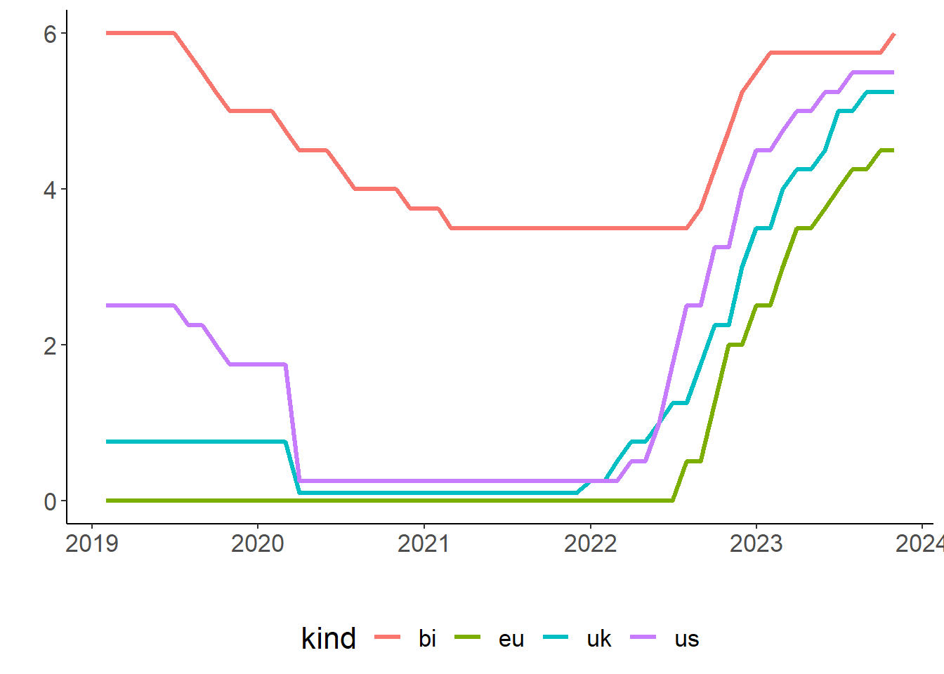 Sumber data pada Figure 2 adalah dari Bank Indonesia (2023). Figure 2 (a) menunjukkan tingginya policy rate dari negara-negara barat. Hal ini diakibatkan oleh tingginya inflasi di jangka waktu tersebut sehingga bank sentral di negara-negara tersebut harus menaikkan suku bunga. Bank Indonesia pun akhirnya harus mengikuti demi mencegah larinya pemegang aset Rupiah ke negara-negara tersebut, yang dapat mendorong pelemahan nilai tukar rupiah.