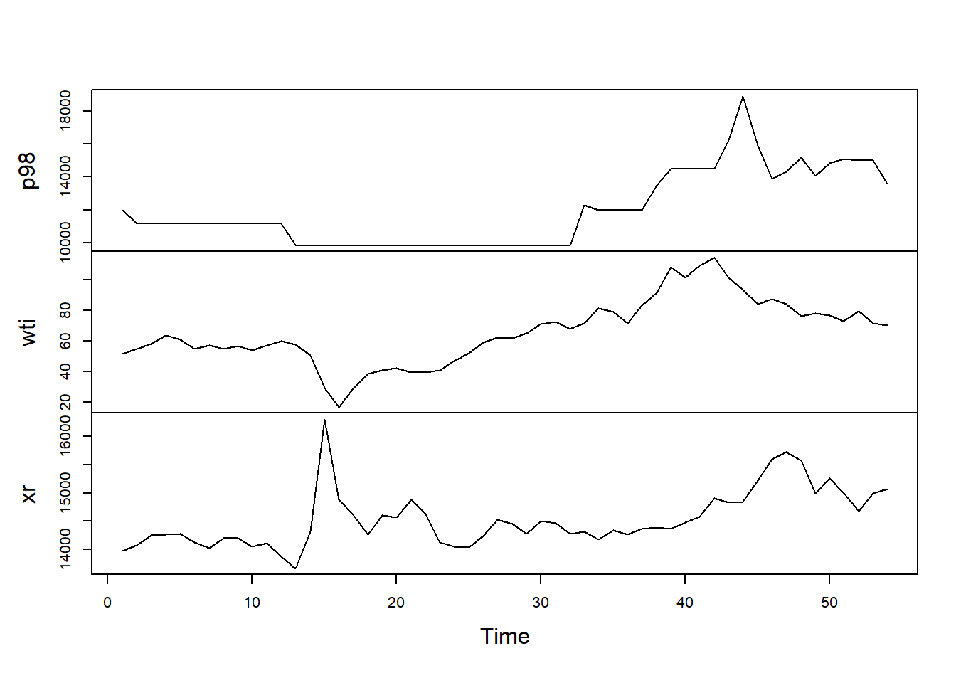 Ekspektasi kita adalah bahwa harga dari RON95/98 dipengaruhi oleh harga WTI dan nilai tukar, tapi tidak sebaliknya1. Artinya, kita harapkan signifikansi dari