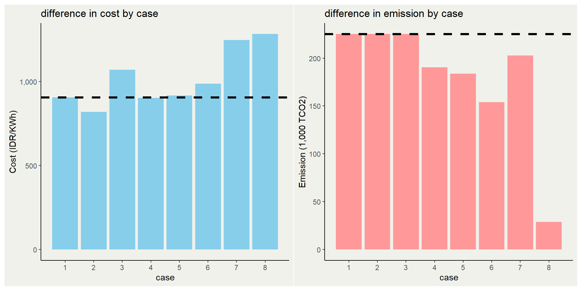 | case | cost (IDR/KWh) | emission (TCO2) | clean (%) | coal (%) | others (%) |