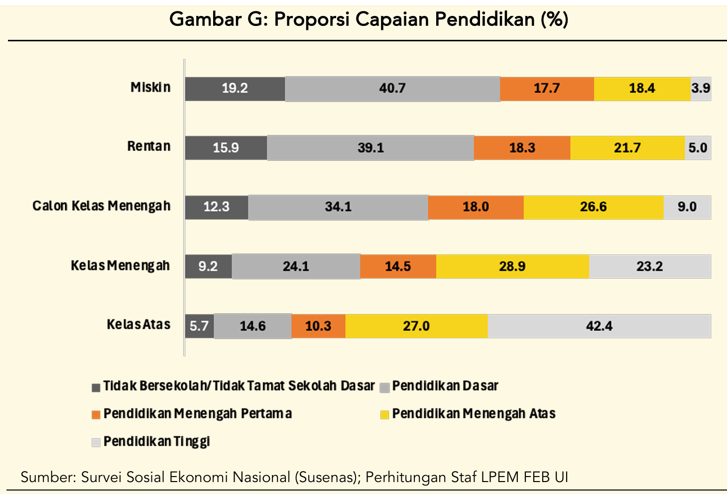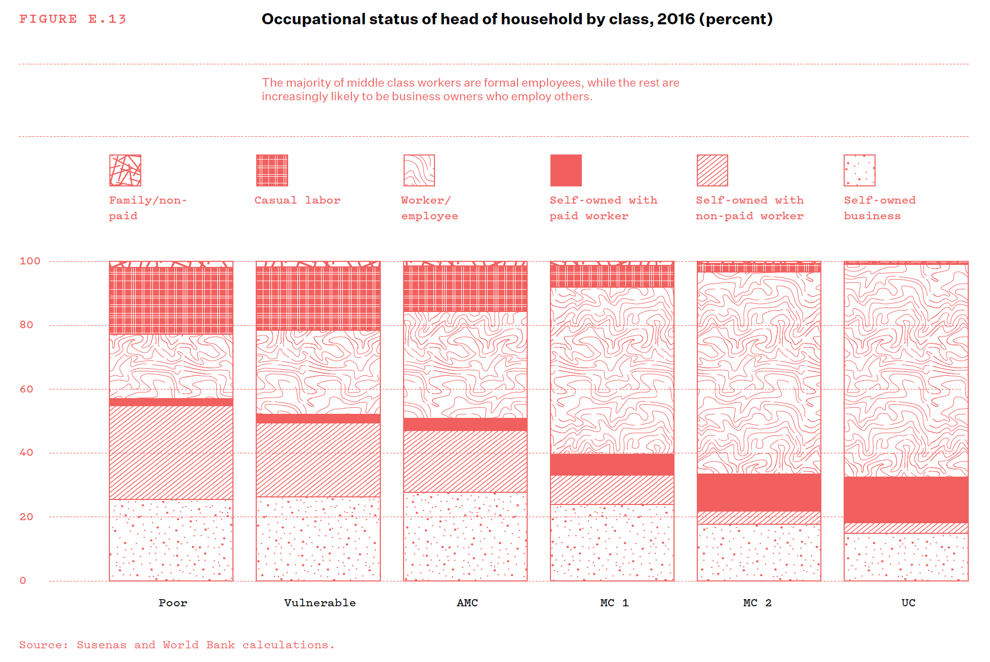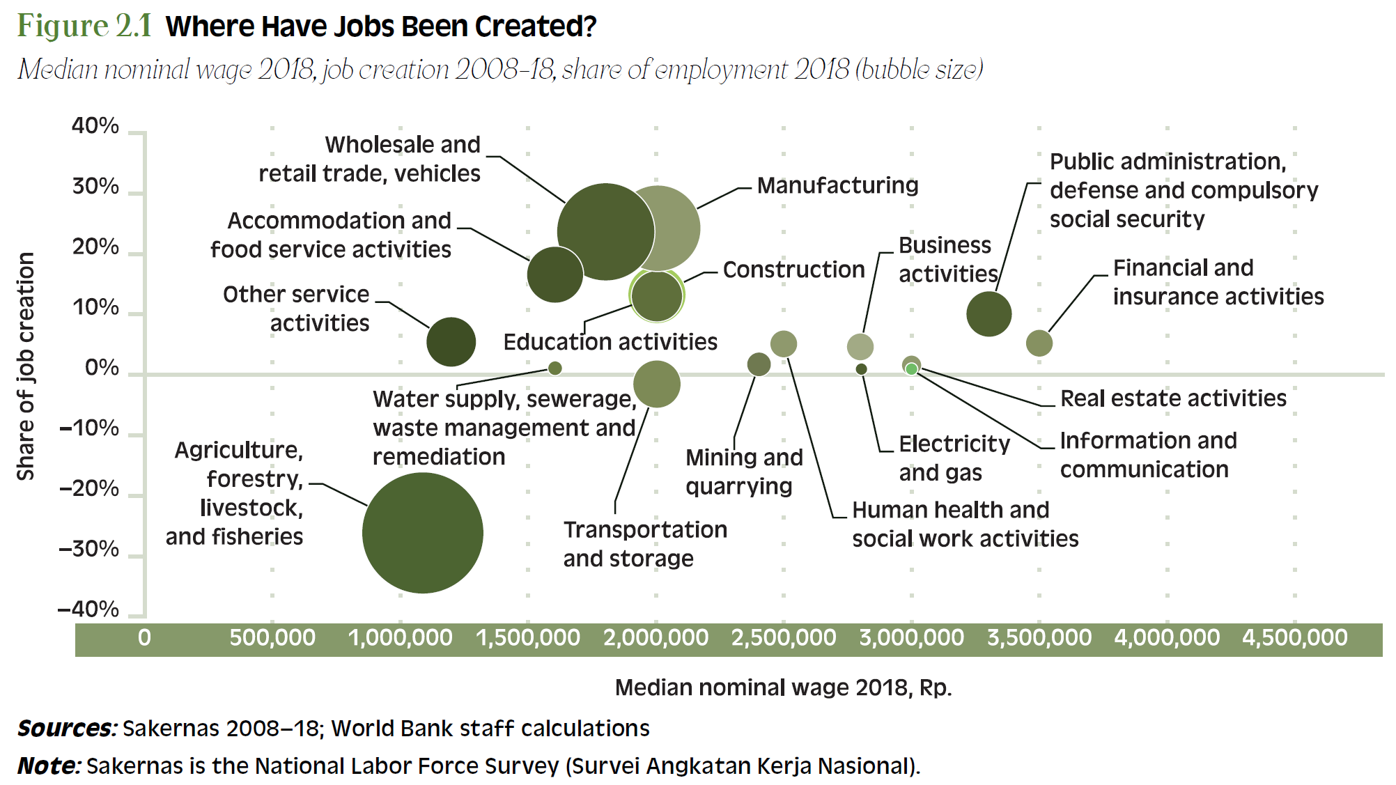 Most Indonesian jobs are of low quality, informal (around 75%), pays lower than middle-class income (also 75%).