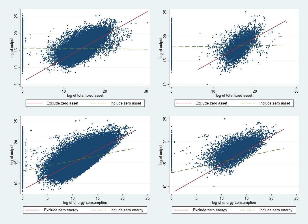 \[y_{it}= \beta_0 + \beta_l l_{it}+ \beta_k k_{it}+ \beta_m m_{it} + \beta_n n_{it} +\mu_{it} \ \ \ \ \ (2)\]