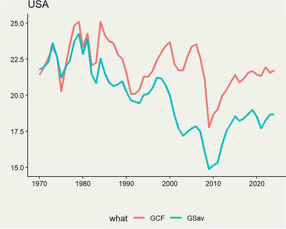 USA constantly has higher GCF compared to its saving rate. Meaning, US sees a constant CAD (current account deficit) which seems to be increasing in 2000s.
