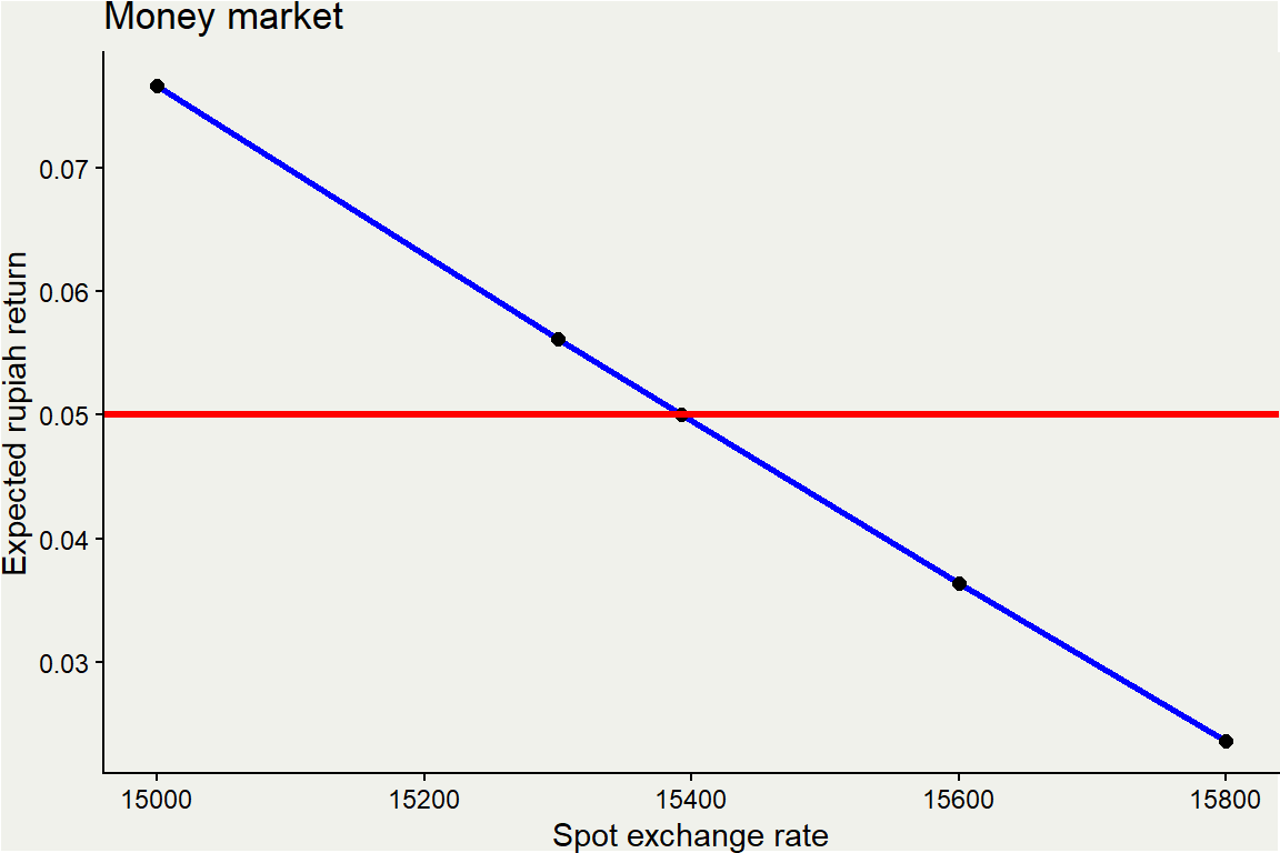 Blue line shows the rupiah return on dollar asset while the red line is the rupiah return on rupiah asset. Intersection is the equilibrium. Any point above red line is a case for holding dollar asset.