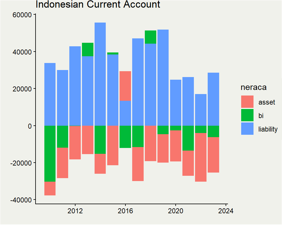 Current account balance (CAB) is simply the difference between Domestic saving (GSav) and investment (Gross Capital Formation, GCF) in Indonesia.