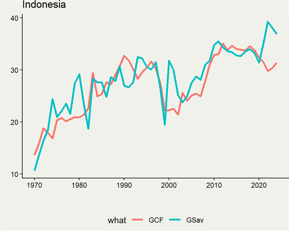 China, meanwhile, see a constant CA surplus with no notable decrease in saving rate (like Japan), but instead tend to go up (like Indonesia)