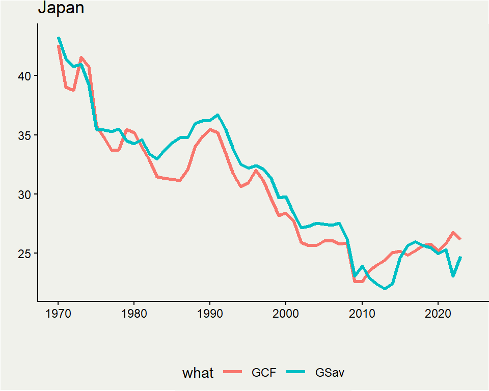 Meanwhile in Japan, saving rate keeps decreasing since 1970. However, Japan constantly see saving>investment (surplus CAB) with notable exceptions.