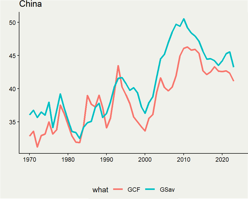China, meanwhile, see a constant CA surplus with no notable decrease in saving rate (like Japan), but instead tend to go up (like Indonesia)