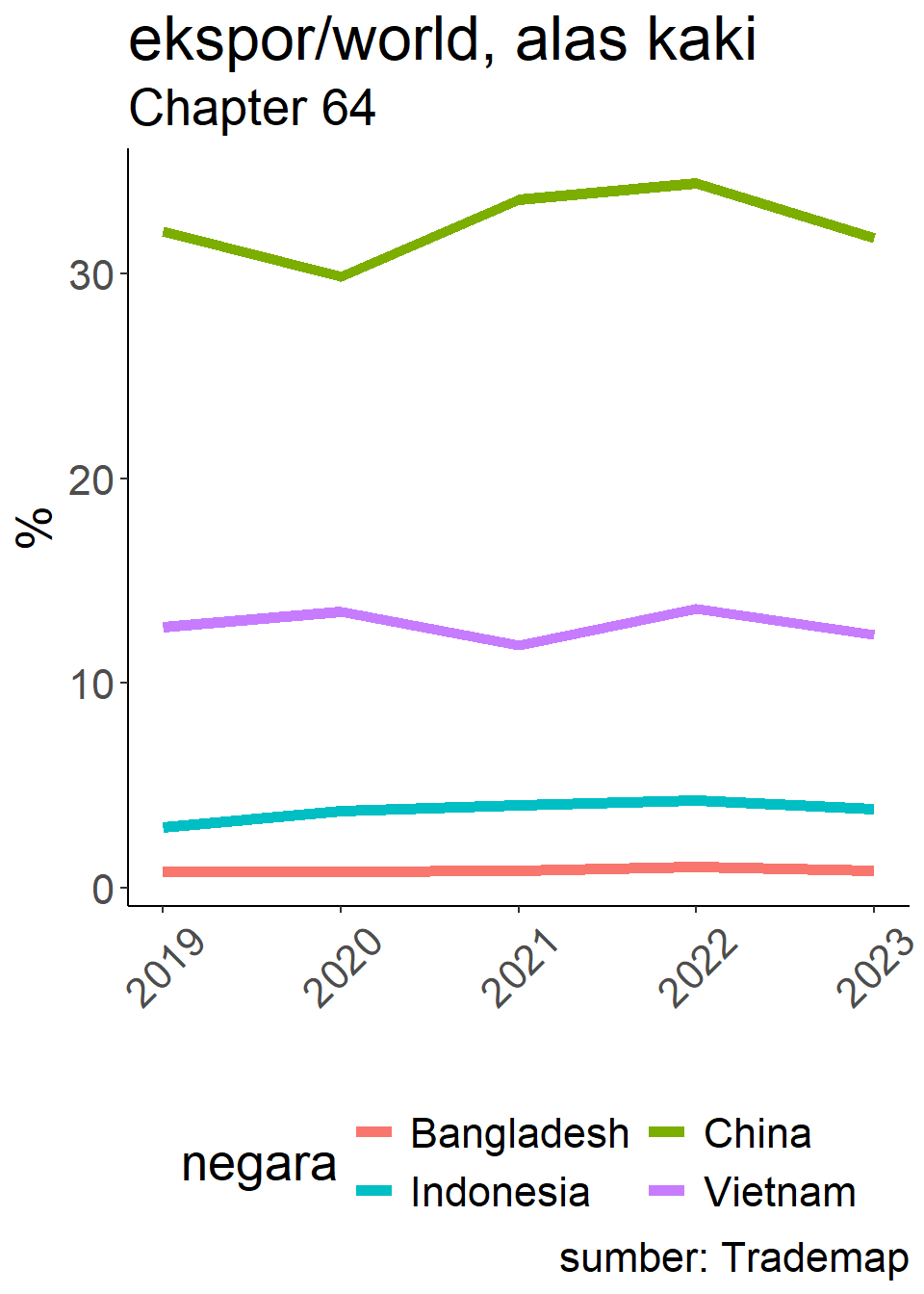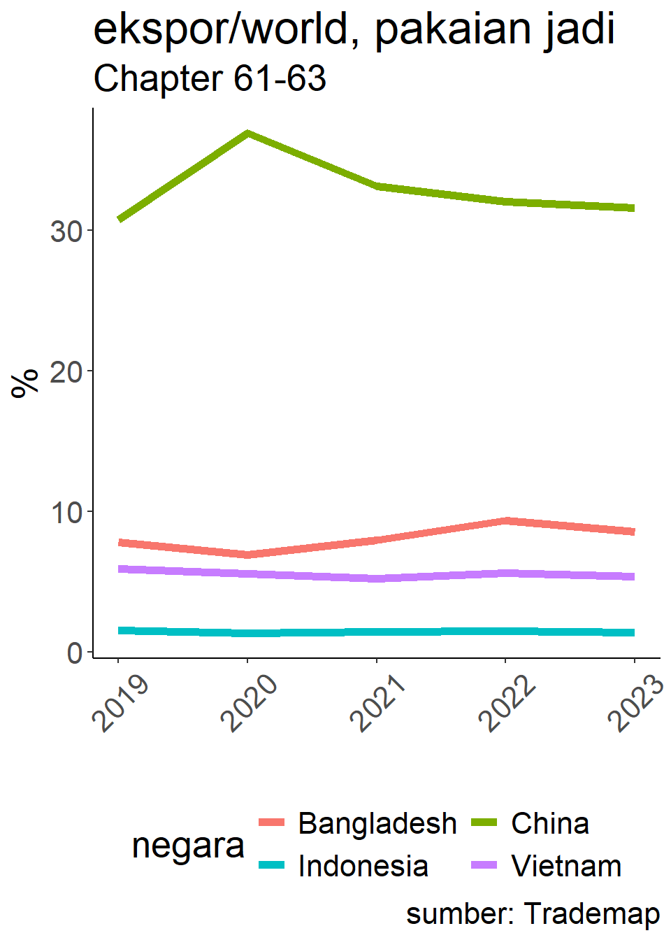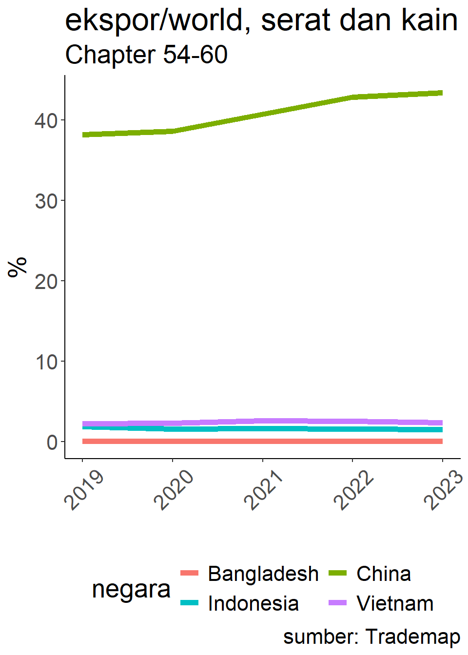 Struktur industri bisa berbeda, tapi di benang, serat dan kain, dominasi RRT makin tinggi. Pakaian jadi dan sepatu berkurang. Bangladesh dan Vietnam spesialisasi.