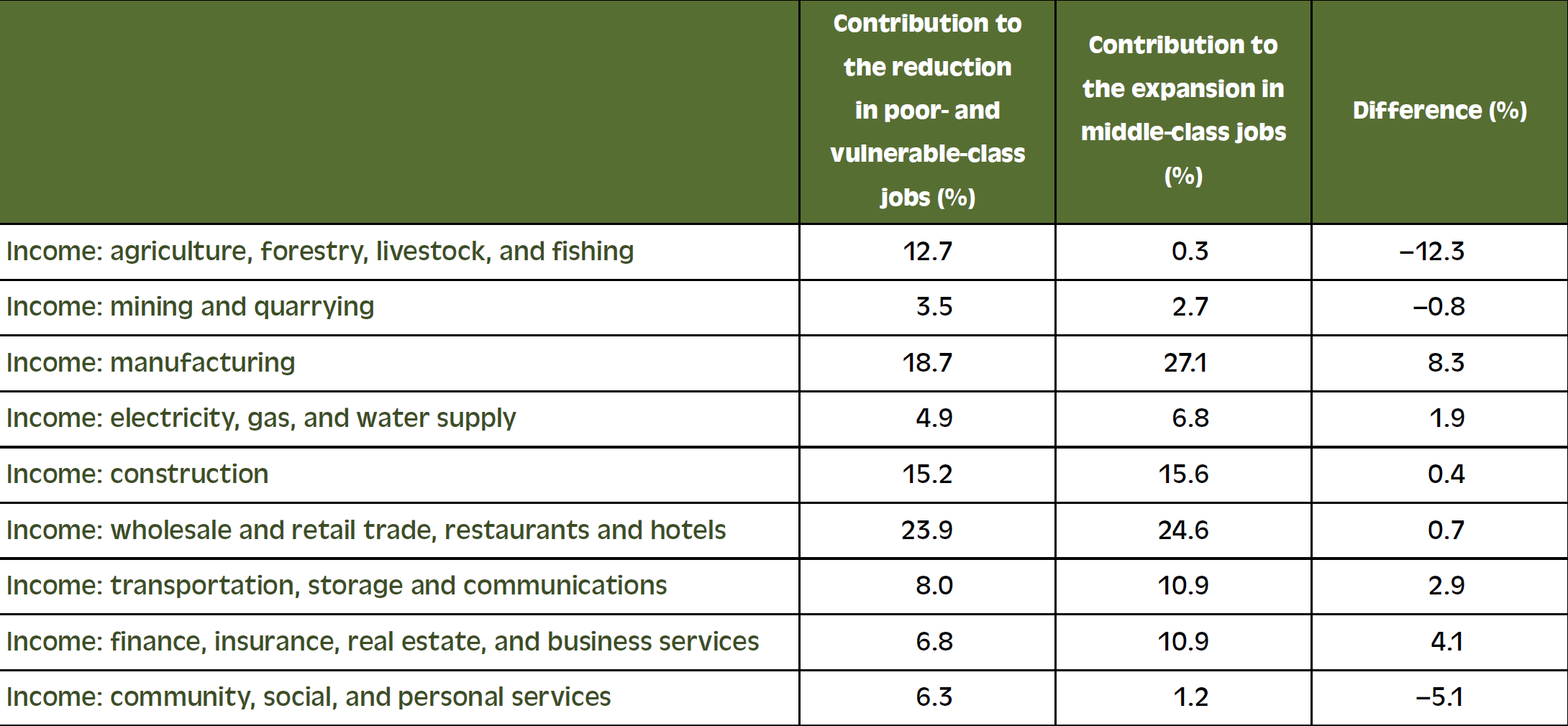 Most jobs come from wholesale/retail and manufacturing. Creating good jobs is the key for middle-class growth. Around half of middle class still work at low productivity services.