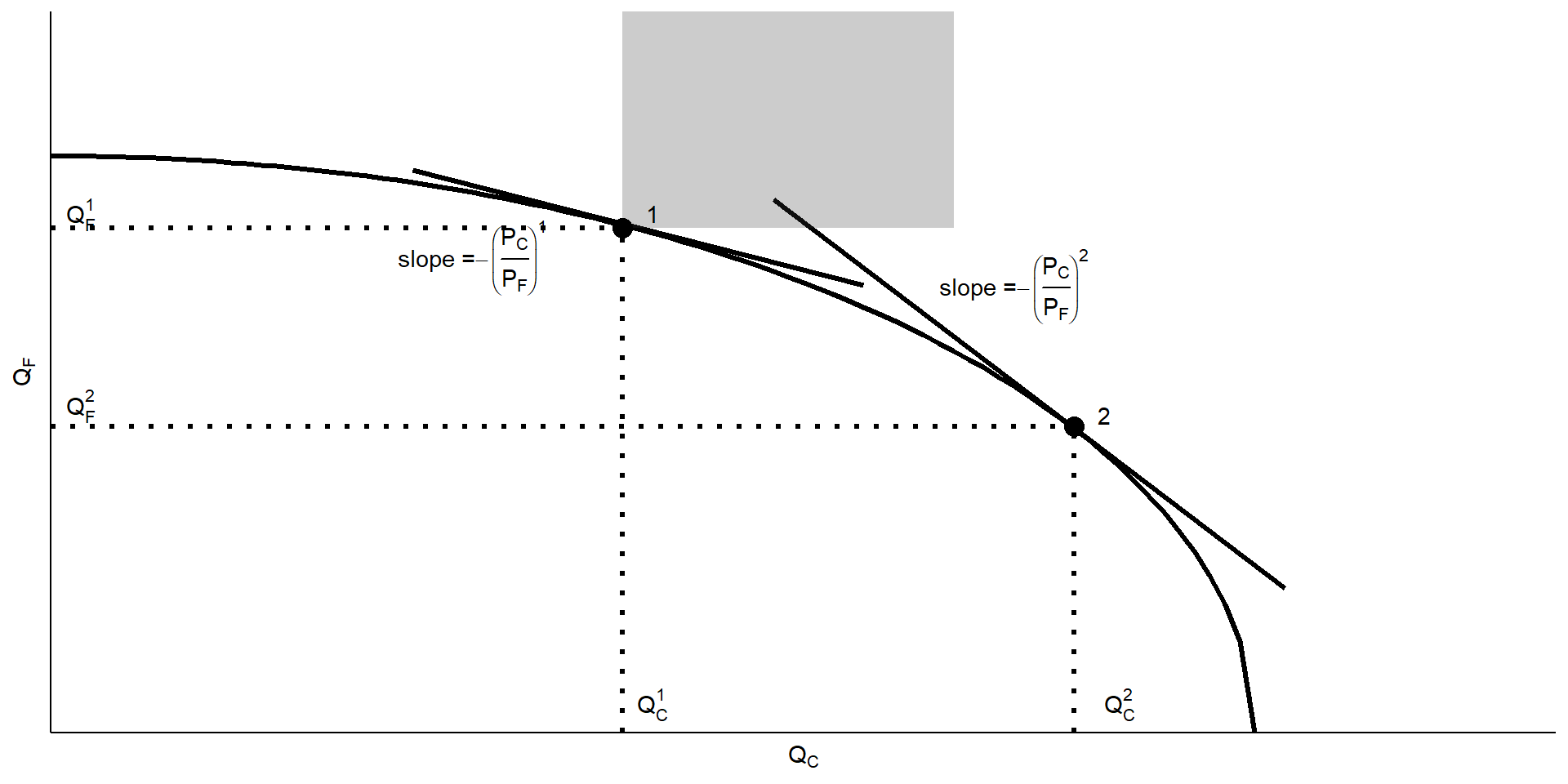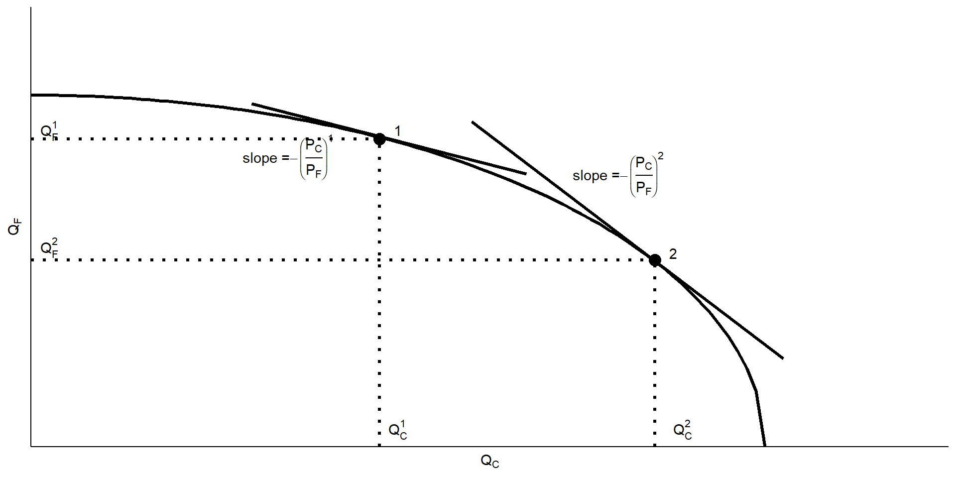 • Produksi terjadi di titik 1, di mana kurva PPF bersinggungan dengan price ratio.