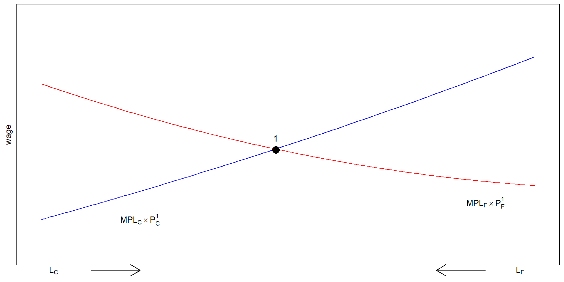 \[\begin{align} MPL_C \times P_C = MPL_F \times P_F = w \\ \\ -\frac{MPL_F}{MPL_C}=-\frac{P_C}{P_F}=w=\text{slope PPF} \end{align}\]